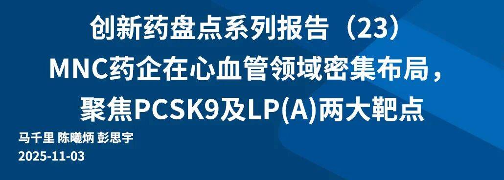 ASCVD疾病承担沉沉,血脂非常是主要的始动要素。ASCVD(Atherosclerotic Cardiovascular Disease,动脉粥样软化心血管疾病)是一类由动脉粥样软化惹起的累及血管和心净疾病的总称,脑血管相关疾病、外周动脉疾病等。ASCVD是全球范畴内首要缘由之一,按照全球疾病承担研数据显示,缺血性心净病正在1990取2021年均位列全球死因第1位。正在美国,2022年冠心病灭亡约37万例、卒中16万例,≥20岁人群中约有1870万人至多履历过一次ASCVD事务;正在中国,2021年缺血性心净病灭亡约196万例、卒中约230万,约7000万人至多有一次ASCVD病史。动脉粥样软化构成机制复杂,此中血脂非常是主要的风险峻素,LDL及Lp(a)/TRL等含有apoB的脂卵白胆固醇正在动脉壁内的堆积,是导致动脉粥样软化构成的始动环节,LDL-C取ASCVD风险的相关性已有充实的实正在世界,但他汀医治后相当比例患者仍未达标,Lp(a)是心血管范畴新兴靶点,做为于LDL-C的“尾部风险”因子,通过动脉粥样软化、促凝及促炎通影响患者发生心血管事务风险。MNC药企正在心血管范畴稠密结构,聚焦PCSK9及Lp(a)两大靶点。海外大型制药企业如Eli Lilly、Novartis、Merck等均正在推进多机制取多药物形态的心血管药物产物矩阵,以全面笼盖复杂的心血管及代谢疾病人群。基于现有的临床研究及实正在世界数据,我们对降脂药物及心血管事务风险获益,相关患者人群分层及远期市场空间进行了会商及测算,估计PCSK9全球市场规模无望达到110~190亿美元,Lp(a)剂市场无望达到30~70亿美元。风险提醒:市场所作加剧的风险、产物临床失败或无效性低于预期的风险、产物贸易化不达预期的风险、手艺升级迭代风险等。