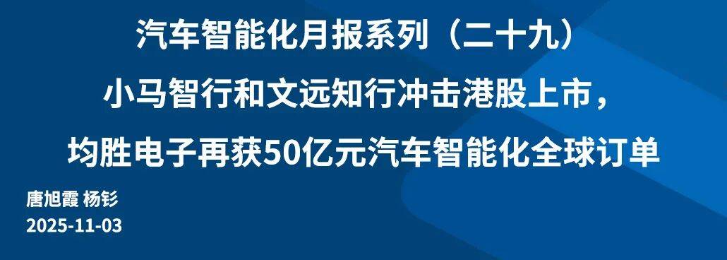 行业旧事:1)特斯拉Robotaxi办事将于岁尾前扩展至8至10个区域;2)小马智行和文远知行招股,拟11月6日港股上市;3)Stellantis取英伟达、优步和富士康合做,加快robotaxi结构;4)禾赛颁布发表2026至2027年继续做为焦点计谋供应商取小米汽车深化合做;5)均胜电子再获50亿元汽车智能化全球订单;6)佑驾立异小竹无人车驶入华强北,聪慧物流新实践;7)九识智能完成蚂蚁领投的B4轮1亿美元融资。高频焦点数据更新:1)800万像素摄像头占比持续提拔。2025年8月,乘用车前视摄像头渗入率67。8%,同比+10pct,环比+1pct,此中800万像素摄像头占比43。8%,同比+27pct,环比+2pct;2)英伟达芯片占比提拔。2025年8月,乘用车驾驶域渗入率33。2%,同比+18pct,环比+2pct,此中mobileye、TI、地平线、英伟达、特斯拉FSD、华为芯片占比2。9%、2。3%、10。1%、57。2%、8。8%、9。8%,同比别离-13、+1、-3、+27、-13、-3pct,环比别离-1、+1、+0。2、+0。1、+2、-2pct。3)激光雷达市占率持续提拔。2025年8月,乘用车激光雷达渗入率10。4%,同比+4。3 pct,环比-0。3 pct。参考盖世汽车,2025H1激光雷达供应商市占率华为(40%)、禾赛科技(28%)、STJC(24%)、图达通(8%)。智能驾驶:标配L2级以上功能的乘用车渗入率8月同比+18pct。2025年8月,乘用车行业L2级以上渗入率33。3%,同比+18pct,高速NOA、城区NOA渗入率别离为33。4%、14。2%,同比+20、+5pct,环比+3、+1pct。1)传感器:前视摄像头、前向毫米波雷达、激光雷达8月渗入率67。8%、57。5%、10。4%,同比+10、+9、+4pct,环比+1、+0、+0pct。2)域节制器:2025年8月,驾驶域控渗入率33。2%,同比+17。5pct,环比+2。0pct。智能座舱:大屏化产物、HUD、座舱域节制器等单品渗入率持续提拔。10寸以上中控屏、10寸以上液晶仪表、HUD、座舱域节制器8月渗入率85%、48。3%、20%、41。1%,同比别离+1、-2、+4、+12pct,环比别离+0、-1、+1、-1pct。