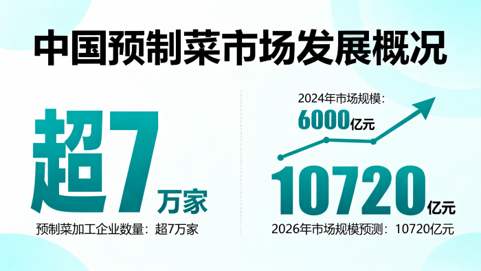 近年来,跟着糊口节拍的加速,预制菜早已融入大活,正在各大电商平台上发卖升温,线下商超内也到处可见。数据显示,目前我国预制菜加工企业跨越7万家,2024年预制菜国内市场规模冲破6000亿元,2026年预制菜市场规模将达10720亿元。